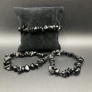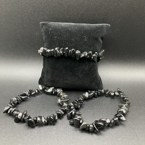 Type bijoux : Bracelet Pierre(s) : Obsidienne Noire Qualité : A Couleur(s) : Noir Apparence : Eclats / Polies Diamètre (en cm) : 16 – 18 cm Photo(s) non contractuelle(s)UGS : BB36