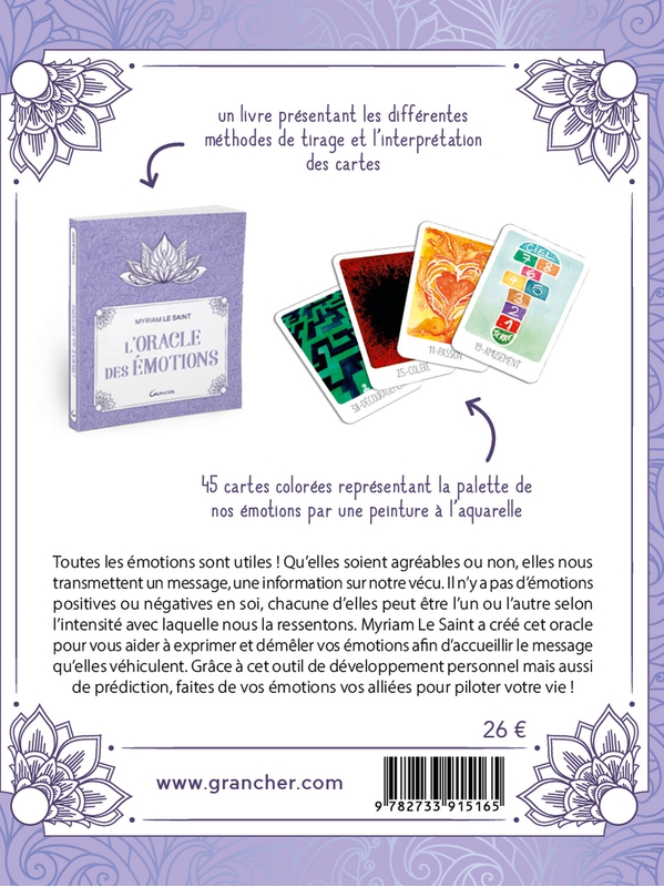 Toutes les émotions sont utiles ! Qu’elles soient agréables ou non, elles nous transmettent un message, une information sur notre vécu. Il n’y a pas d’émotions positives ou négatives en soi, chacune d’elles peut être l’un ou l’autre selon l’intensité avec laquelle nous la ressentons. Myriam Le Saint a créé cet oracle pour vous aider à exprimer et démêler vos émotions afin d’accueillir le message qu’elles véhiculent. Grâce à cet outil de développement personnel mais aussi de prédiction, faites de vos émotions vos alliées pour piloter votre vie !