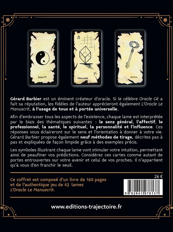 Gérard Barbier est un éminent créateur d’oracle. Si le célèbre Oracle Gé a fait sa réputation, les fidèles de l’auteur apprécieront également L’Oracle LeManuscrit, à l’usage de tous et à portée universelle. Afin d’embrasser tous les aspects de l’existence, chaque lame est interprétée par le biais des thématiques suivantes : le sens général, l’affectif, le professionnel, la santé, le spirituel, la personnalité et l’influence. Ces réponses vous éclaireront sur le sens et l’orientation à donner à votre vie. Gérard Barbier propose également neuf méthodes de tirage, décrites pas à pas et expliquées de façon limpide grâce à des exemples précis. Les symboles illustrant chaque lame vont stimuler votre intuition, permettant ainsi de peaufiner vos prédictions. Considérez ces cartes comme autant de portes entrouvertes sur votre avenir et celui de vos proches. Il n’appartient qu’à vous d’en franchir le seuil.